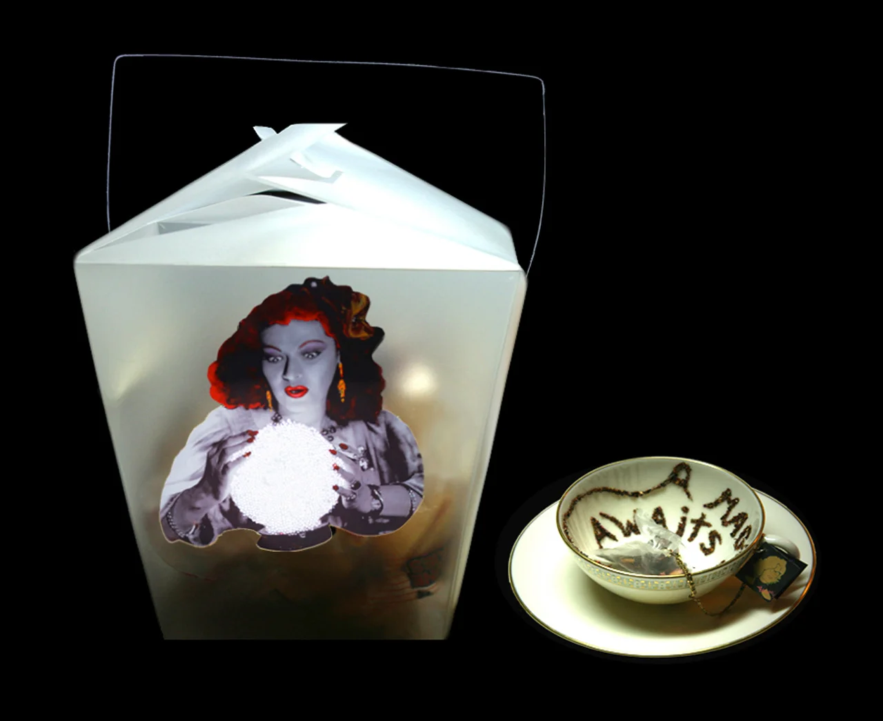 The cup and saucer are placed in a translucent plastic version of the classic chinese food take-out container; inside the container, real fortune cookies support the cup and saucer.
